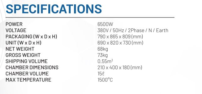 Furnace model 932 with 6500W power. Chamber size is 15 Liters with maximum temperature of 1500 °C. Assembled on order with a 2 to 4 week lead time.