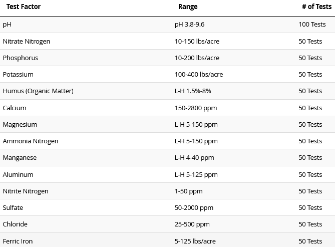Tests for nitrate nitrogen, potassium, phosphorus, magnesium, manganese, aluminum, sulfates, ammonia nitrogen, nitrite nitrogen, chlorides, ferric iron, calcium, humus, and pH. Contains solutions and equipment for 50 tests for each element and 100 tests for pH. Results for nitrite nitrogen, nitrate nitrogen, phosphorus, and potassium are given in lbs./acre. Humus results are given in a %. All other parameters are given in ppm. Major element qualitative tests can be performed on green plant tissue for nitrogen, phosphorous, and potassium. Complete instructions included.
