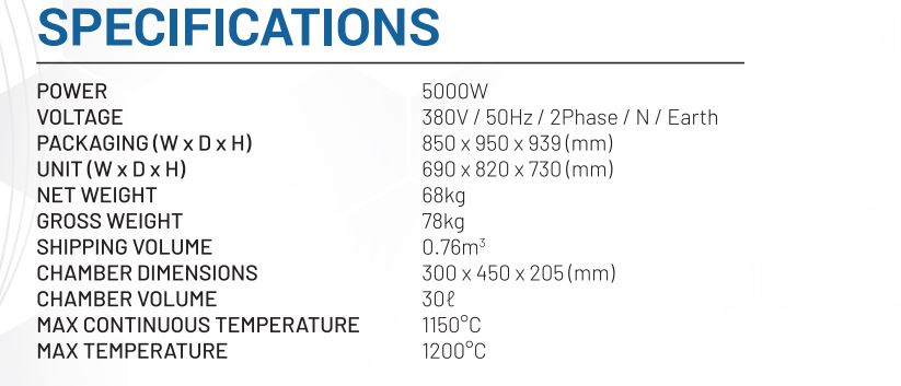 Chamber size is 30 Liters with maximum temperature of 1200 °C.