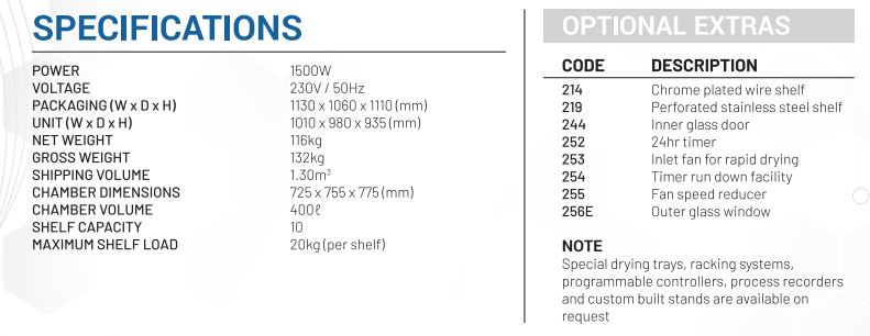 400L digital incubator with 1500W power. Assembled on order with a 2 to 4 week lead time.