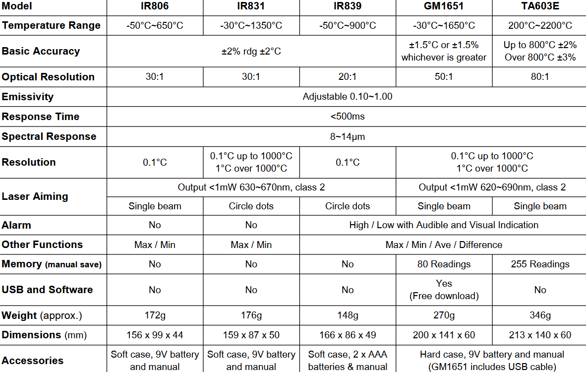 Mid-range, single laser, 50:1 spot, -30~+1650°C, USB, emissivity adjustable c/w case