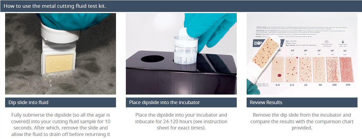 There are 2 boxes of dipslides in this kit (20 dipslides). To test your metal cutting fluid using these dipslides, carefully dip the slide within the fluid and immerse fully, then replace the slide within its tube. You will then need to incubate the slides, and once incubated, compare the results with the comparison chart provided to evaluate if contamination is present.
