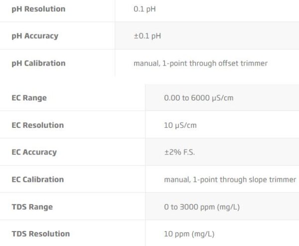 The EC/TDS readings are performed by an amperometric sensor. An alternating voltage is applied to the sensor and the amount of current that passes between the two stainless steel pins is dependent upon the amount of salts (fertilizer) present. A greater amount of salt present results in an increase in conductance.