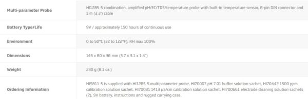 The supplied HI1285-51 probe is a polypropylene body, amplified pH electrode with a built-in EC/TDS and temperature sensors. The amplifier for the pH electrode prevents interference from humidity and electrical noise from common sources including from motors, ballasts or pumps. The HI9811-15 is a versatile meter best suited for agricultural, greenhouse and hydroponic applications.