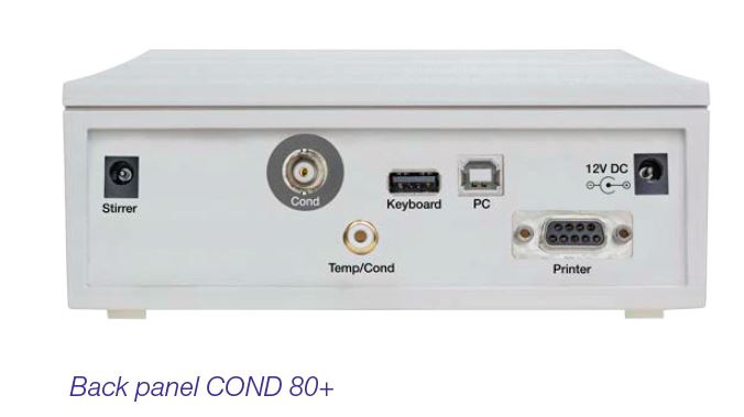 COND 80+ kit STIRRER with glass conductivity cell VPT 80/1, conductivity standard solutions 1413 μS and 12,88 mS, soft keypad, power supply, and accessories. With stirrer