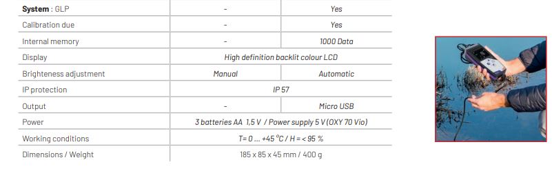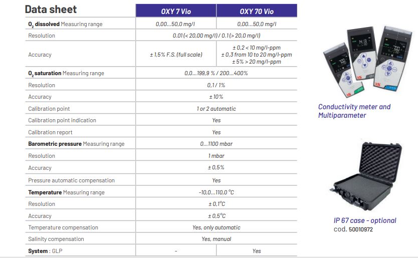 Oxy 7 Vio with polarographic sensor OXY DO7/MT with 3 mt cable, 1 bottle 0 Oxygen standard, 1 replacement membrane cap, 1x30ml filling solution, carrying case and accessories. Lead time 4-6 weeks.